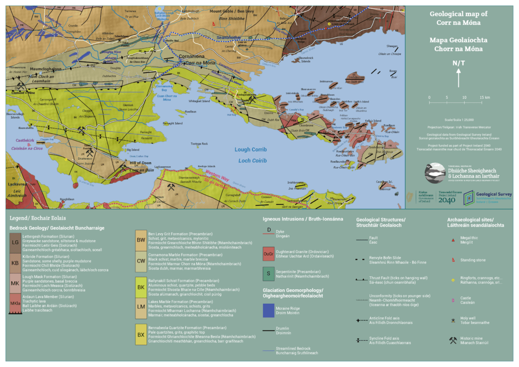 One of the most scenic areas of the country, Corr na Móna is a popular site among trout and salmon anglers. The eastern edge of the area comes down to the shores of Lough Corrib while the western edge borders the scenic upland area of An Mám, the Maam Valley and the Maumturk Mountains.