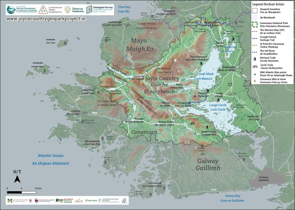 The Western Way is a long-distance walking trail of more than 200 km that passes through Counties Galway and Mayo. The trail begins in Oughterard, Co Galway, and finishes in Bunnycibbellan, Co Mayo. The whole trail has integrated the International Appalachian Trail (IAT) in 2023 (more info 在此) thanks to the Mám Éan Geotrail development by the Geopark and JCWL Geoenterprise, The distances below focus on the section that passes through the aspiring geopark area, from Oughterard to Westport.